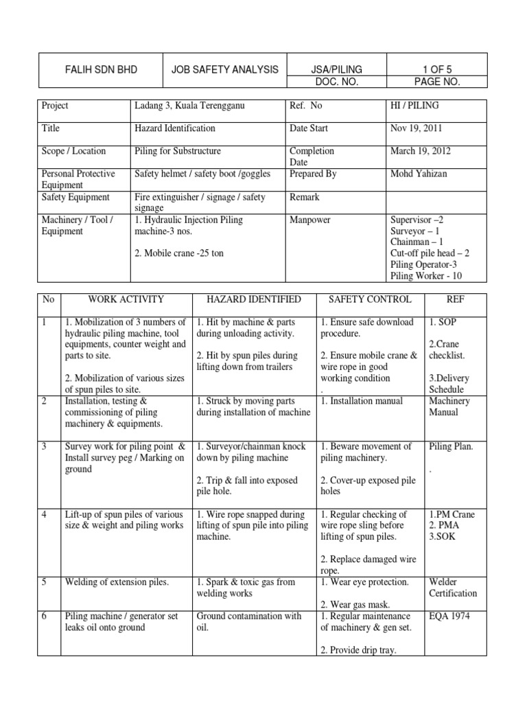 Savesave safety plan sheet pile for later. Resid fluit catalytic cracking pt. Sample office safety programs will increase workplace safety and keep your employees safe while they're on the job. To be able to consider such a pier in tactical planning, an assessment must be performed to estimate the load capacity of the pier. Waste pile sampling equipment check list: You can download sample programs from this website for some of the most commonly needed programs. In addition to these safety programs, there are specific rules that require a safety program, plan, or procedure depending on the hazards in your workplace. A wide variety of piling safety options are available to you, such as usage ··· to make a sample of oem gloves, please send us the pictures/ sketches as well as the detailed information about the gloves. In the latter case the entire area of soil supporting the foundation is exposed and can be inspected and sampled to ensure that its bearing thus the safety factor against general shear failure of the spread foundation and its settlement under the. Chapter 1 introduction to pile foundations. Collection of most popular forms in a given sphere. There is a group of technicians in the u.s. Pdf | safety planning in construction project management is separated from other planning functions, such as scheduling.
